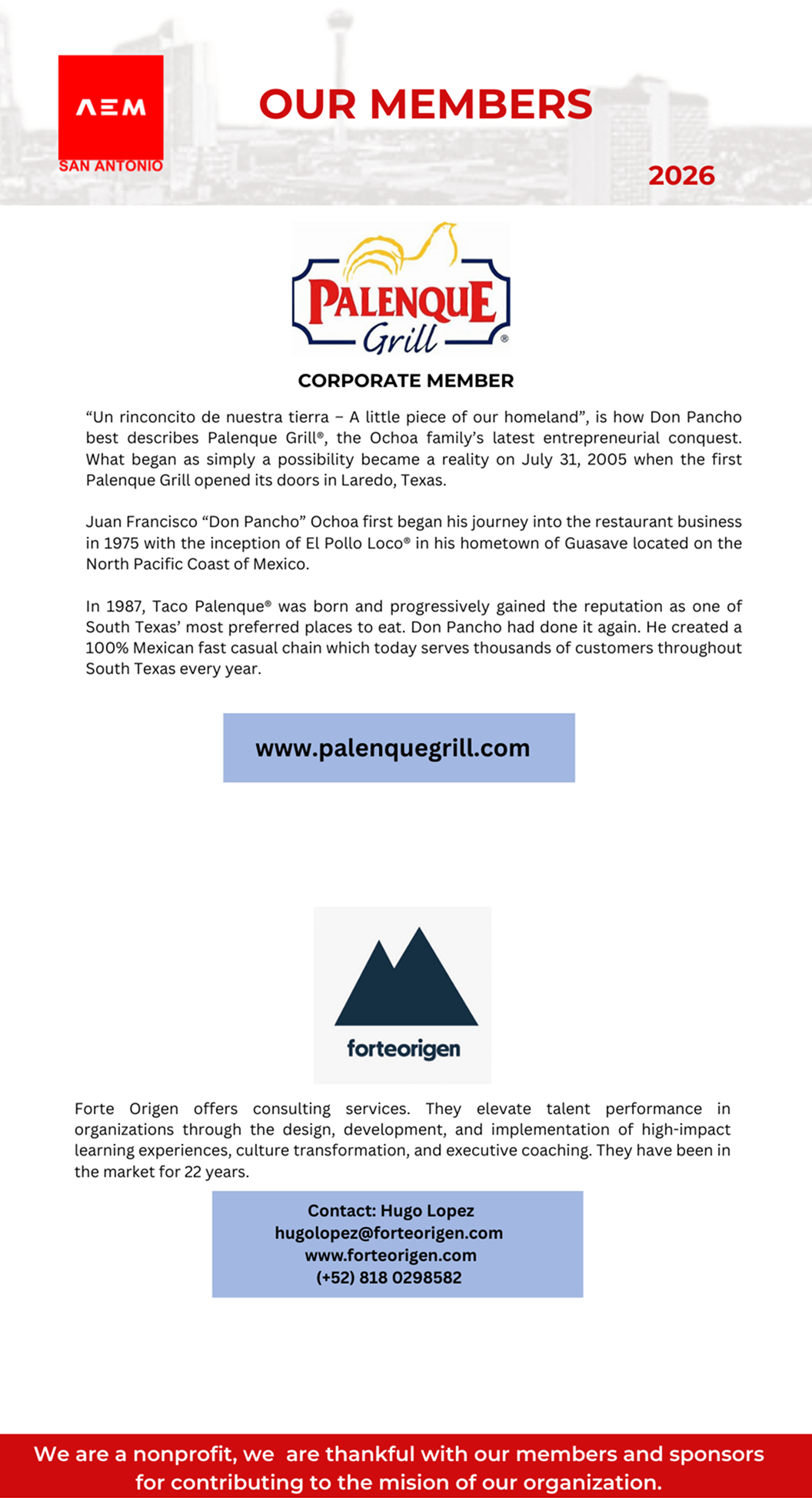 - We are actively involved in the community promoting business culture and strengthening ties with other charitable organizations in MX and the USA.
